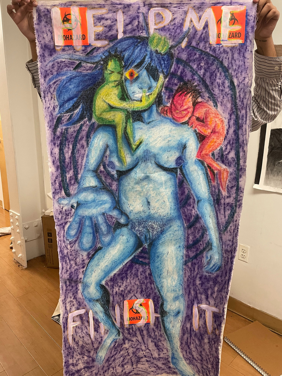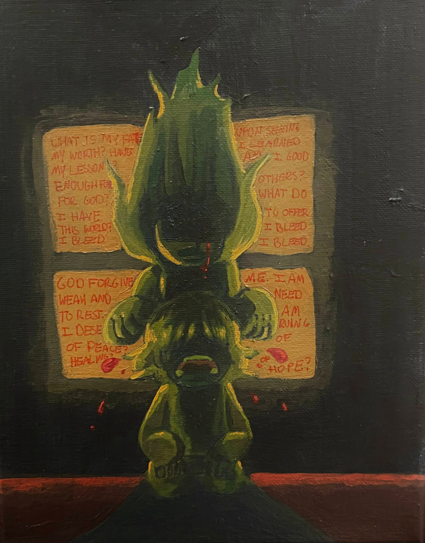 Marcélo Saavedra (b.2000) is a multimedia artist from West Palm Beach, FL who is currently based in Baltimore, MD. He is a current student working on his BFA at the Maryland Institute College of Art (MICA), majoring in General Fine Arts and minoring in Animation. Saavedra has received several merit based grants and scholarships. He is scheduled to graduate in the spring of 2025. Saavedra’s work aims to evoke complex emotions in his viewer with his raw subject matter pertaining to his experiences with complex, repeated traumas and hardships due to his disabilities and identity. He also focuses on relationships between humans and technology, informed by his own empathetic experiences with technology. Saavedra’s exploration with his emotions are evident through his rough mark making, repetition, varying textures, and vibrant colors. His works have been shown at exhibitions at his college.
